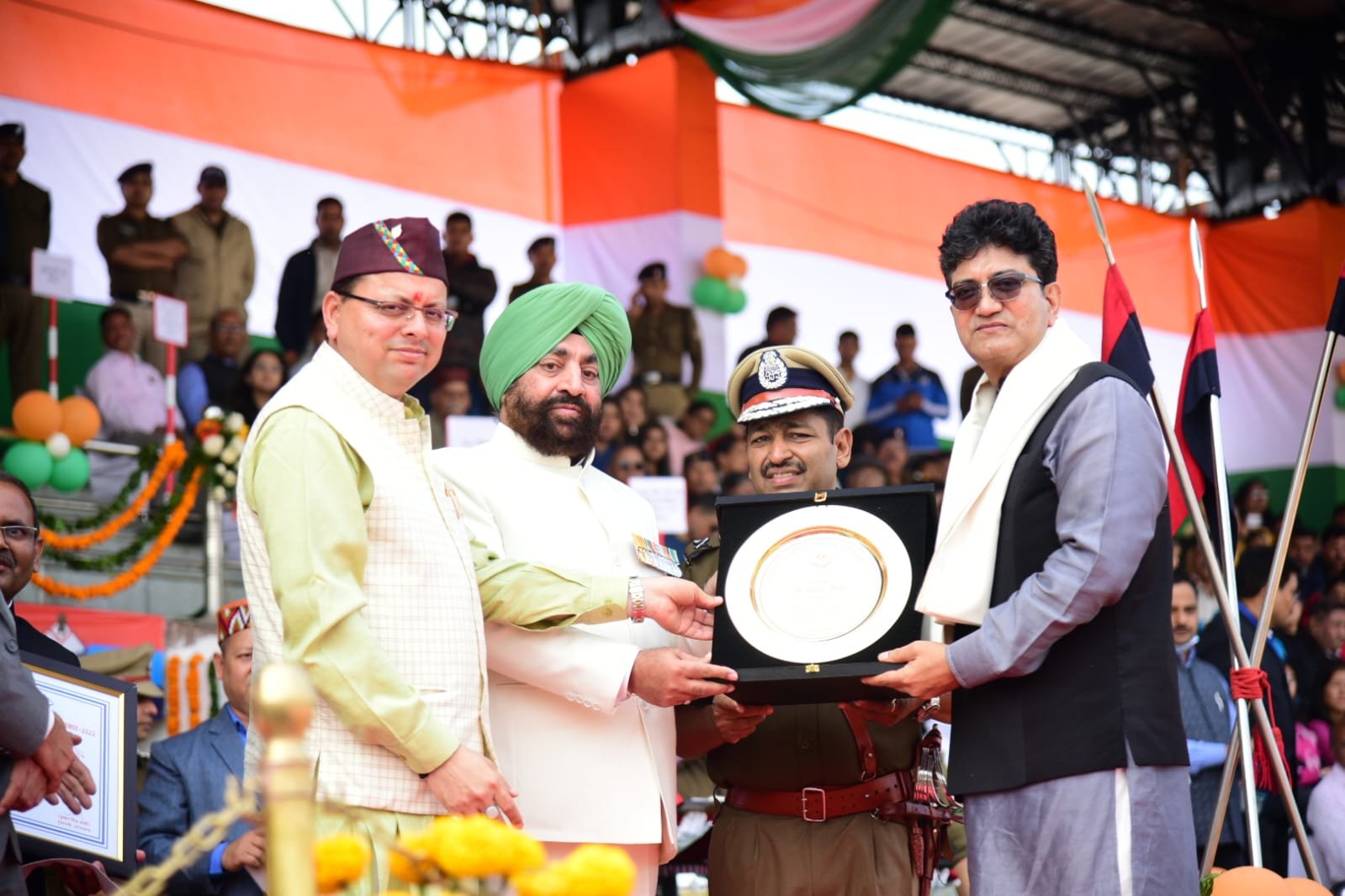 देहरादून। उत्तराखण्ड राज्य स्थापना दिवस के अवसर पर बुधवार को रेसकोर्स स्थित पुलिस लाईन में आयोजित मुख्य कार्यक्रम में राज्यपाल लेफ्टिनेंट जनरल गुरमीत सिंह (से. नि) एवं मुख्यमंत्री पुष्कर सिंह धामी ने प्रतिभाग किया। इस अवसर पर राज्यपाल ने रैतिक परेड का निरीक्षण कर सलामी ली। राज्यपाल ने विशिष्ट सेवाओं के लिए ‘राष्ट्रपति पुलिस पदक’ प्राप्त पुलिस अधिकारियों को सम्मानित भी किया। इस अवसर पर राज्यपाल एवं मुख्यमंत्री द्वारा उत्तराखण्ड पुलिस पत्रिका 2022 का विमोचन किया गया। नैनीताल जनपद की चोरगलिया थाने को सर्वश्रेष्ठ पुलिस थाने के रूप में सम्मानित किया गया। राज्य स्थापना दिवस के मुख्य कार्यक्रम में राज्यपाल लेफ्टिनेंट जनरल गुरमीत सिंह (से. नि) एवं मुख्यमंत्री पुष्कर सिंह धामी ने उत्तराखण्ड गौरव सम्मान पुरस्कार-2022 एवं उत्तराखण्ड गौरव सम्मान पुरस्कार-2021 के महानुभावों को सम्मानित भी किया। उत्तराखण्ड गौरव सम्मान से सम्मानित महानुभावों को सम्मान पत्र, ट्रॉफी एवं एक लाख रुपये की धनराशि का चेक प्रदान किया गया। उत्तराखण्ड गौरव सम्मान 2022 से भारत के राष्ट्रीय सुरक्षा सलाहकार अजीत डोभाल, कवि लेखक, गीतकार एवं सेंसर बोर्ड के अध्यक्ष प्रसून जोशी, भूतपूर्व चीफ ऑफ डिफेंस स्टाफ स्व. जनरल बिपिन रावत, कवि लेखक एवं गीतकार स्वं गिरीश चन्द्र तिवारी ‘गिर्दा’, साहित्यकार एवं पत्रकार स्व. वीरेन डंगवाल को सम्मानित किया गया। जबकि 2021 के उत्तराखण्ड गौरव सम्मान से उत्तराखण्ड के पूर्व मुख्यमंत्री स्व. नारायण दत्त तिवारी, पर्यावरणविद् डॉ. अनिल प्रकाश जोशी, साहित्यकार रस्किन बॉण्ड, साहसिक खेल के क्षेत्र में बछेन्द्री पाल तथा संस्कृति एवं लोक कला के क्षेत्र में नरेन्द्र सिंह नेगी को सम्मानित किया गया। प्रसून जोशी एवं नरेन्द्र सिंह नेगी कार्यक्रम के दौरान सम्मानित किये गये। उत्तराखण्ड गौरव सम्मान के अन्य महानुभावों के परिवारजनों द्वारा सम्मान लिया गया।