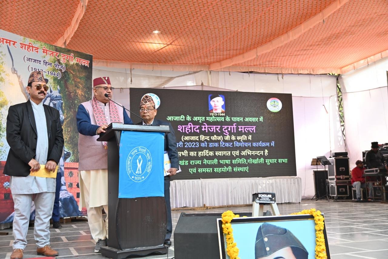 देहरादून। उत्तराखण्ड राज्य नेपाली भाषा समिति एवं सहयोगी संस्थाओं द्वारा आज आजाद हिंद फौज के नेता सुभाष चंद्र बोस के जन्मदिवस के पावन अवसर पर अमर शहीद मेजर दुर्गा मल्ल डाक टिकट विमोचन कार्यक्रम शहीद मेजर दुर्गा मल्ल योगा पार्क गढ़ी कैंट में हर्षोल्लास के साथ भव्य रूप में किया गया। कार्यक्रम में मुख्यमंत्री पुष्कर सिंह धामी के साथ कैबिनेट मंत्री गणेश जोशी ने कार्यक्रम में प्रतिभाग किया।