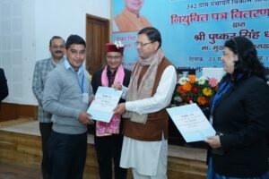 देहरादून। मुख्यमंत्री पुष्कर सिंह धामी ने रविवार को मुख्यमंत्री आवास स्थित मुख्य सेवक सदन में पंचायती राज विभाग द्वारा आयोजित नियुक्ति पत्र वितरण समारोह में पंचायती राज विभाग के 08 सहायक लेखाकारों तथा 342 ग्राम पंचायत विकास अधिकारियों को नियुक्ति पत्र प्रदान किये। सहायक लेखाकारों का चयन लोक सेवा आयोग तथा ग्राम पंचायत विकास अधिकारियों का चयन अधीनस्थ सेवा चयन आयोग के माध्यम से किया गया है। मुख्यमंत्री ने सभी चयनित कार्मिकों को शुभकामना देते हुए कहा कि नियुक्ति पाने वाले लेखाकार एवं ग्राम पंचायत विकास अधिकारी हमारी लोकतांत्रिक व्यवस्था के प्राथमिक इकाई ही नहीं इसकी नींव के समान है। पंचायती राज व्यवस्था जितनी सशक्त होगी हमारा लोकतंत्र भी उतना ही मजबूत होगा, तभी सुराज की परिकल्पना भी साकार हो सकेगी। उन्होंने कहा कि समाज के अंतिम छोर पर खड़े व्यक्ति की परेशानी, उसकी शिकायत को सरकार तक पहुंचाने और सरकार द्वारा किए जा रहे लोक कल्याणकारी कार्यों को जन-जन तक पहुंचाने में आप सभी की महत्वपूर्ण भूमिका रहती है।