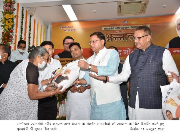मुख्यमंत्री पुष्कर सिंह धामी ने अन्नोत्सव प्रधानमंत्री गरीब कल्याण अन्न योजना के अंतर्गत लाभार्थियों को खाद्यान्न के किट वितरित किये। जनता दर्शन हाल सीएम आवास में आयोजित कार्यक्रम में मुख्यमंत्री ने छः लाभार्थियों को किट प्रदान किये। इसी प्रकार अन्नोत्सव कार्यक्रम में सम्पूर्ण माह राज्य की समस्त 9230 राशन की दुकानों के माध्यम से नि शुल्क खाद्यान्न का वितरण किया जाएगा। कुल 14 लाख राशन थैलों का वितरण होगा।
