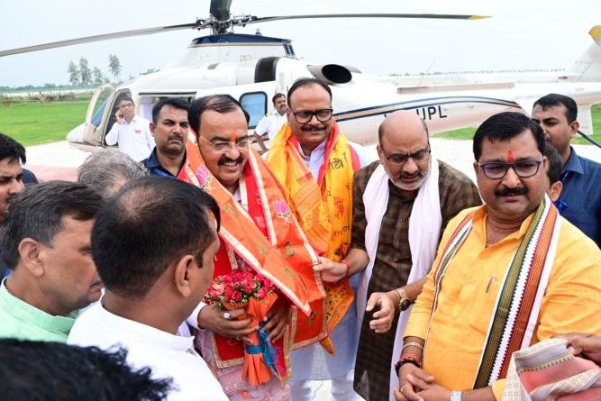 उपमुख्यमंत्री केशव प्रसाद मौर्य और उपमुख्यमंत्री ब्रजेश पाठक का जिले के अधिकारियों के साथ भाजपा के नेताओं ने भव्य स्वागत किया। केशव प्रसाद मौर्य के साथ ही ब्रजेश पाठक का आज अयोध्या में हनुमान गढ़ी तथा श्रीराम जन्मभूमि मंदिर में दर्शन-पूजन का कार्यक्रम है। मौर्य के साथ पाठक राम कथा पार्क हेलीपैड से हनुमानगढ़ी पहुंचे। हनुमानगढ़ी के बाद इनका राम जन्मभूमि में दर्शन-पूजन का कार्यक्रम है।