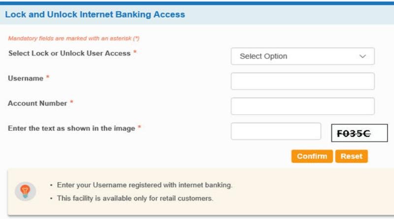 - ‘लॉक एंड अनलॉक यूजर’ ऑप्शन का चुनाव करें। एक नया विंडो खुलेगा। ड्रॉप डाउन मेनू से ‘अनलॉक यूजर एक्सेस’ का चयन करें। उसके बाद, अपना डिटेल डालें जैसे कि इंटरनेट बैंकिंग यूजर्स का नाम, खाता संख्या और कैप्चा कोड।