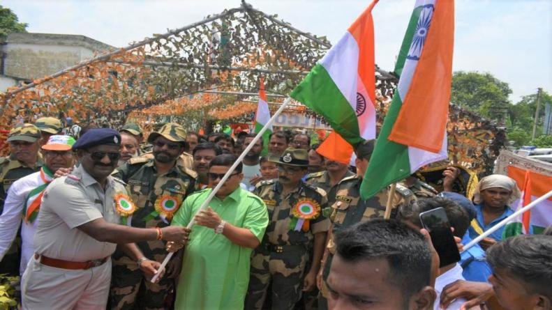 कोलकाता स्वतंत्रता की 75वीं वर्षगांठ पर मनाए जा रहे आजादी का अमृत महोत्सव और हर घर तिरंगा कार्यक्रम के तहत बीएसएफ के उत्तर बंगाल फ्रंटियर अंतर्गत 72वीं वाहिनी की ओर से भारत-बांग्लादेश सीमा के पास विशाल तिरंगा यात्रा का आयोजन किया गया। कमांडेट की अगुवाई में बीएसएफ की सीमा चौकी पंजीपारा इलाके में शनिवार को आयोजित इस तिरंगा यात्रा में सीमा सुरक्षा बल के अधिकारियों एवं कार्मिको सहित सीमावर्ती क्षेत्र के विभिन्न स्कूलों के हजारों बच्चों ने हिस्सा लिया।